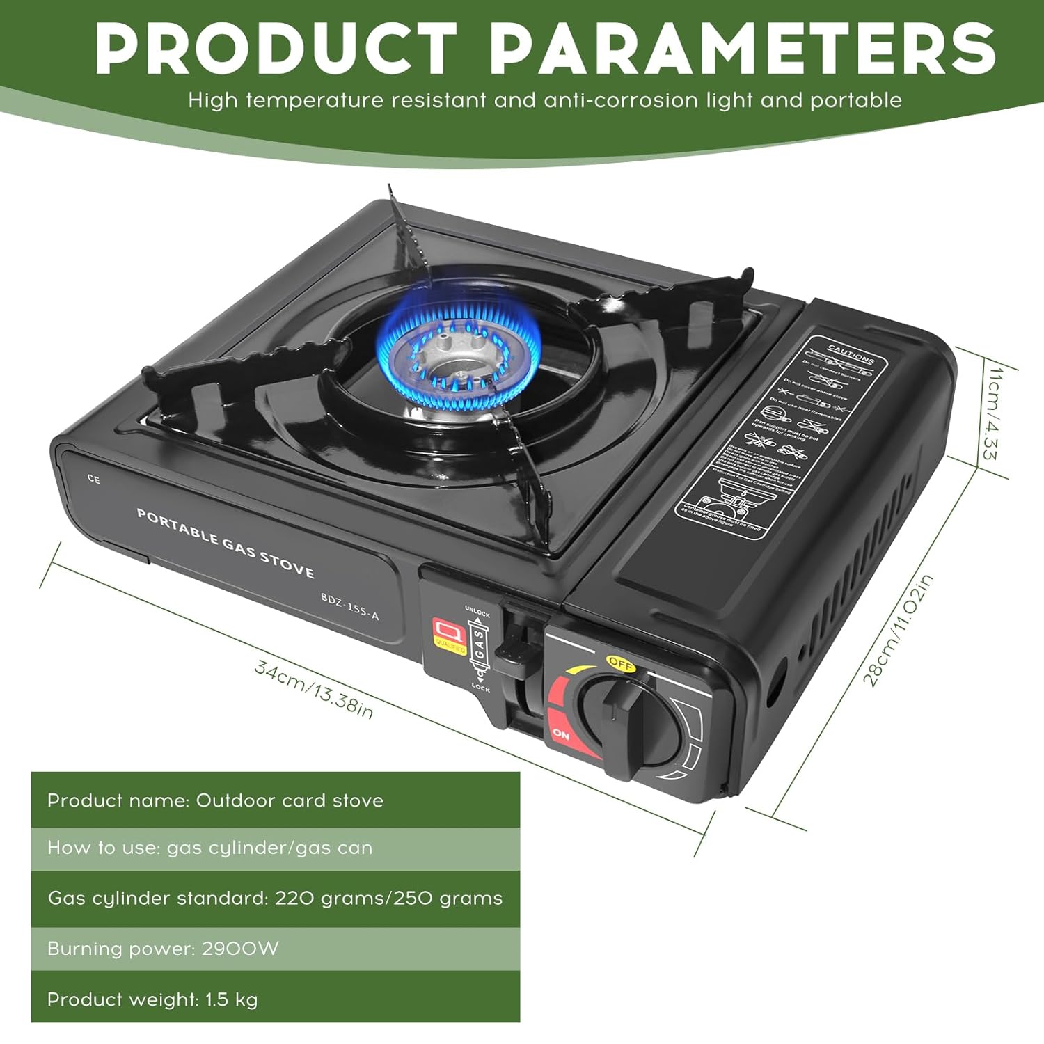 - Note - The pot diameter should not exceed 22 cm to avoid overheating reaction. Applicable gas cylinders: 220g, 250g standard/international standard liquid butane bottles (not included). The combustion power of the gas stove is 2900 W, which means stronger firepower and a longer continuous burning time. Gas consumption 158 g/h; running time 1.2 hours. Not suitable for use in enclosed spaces